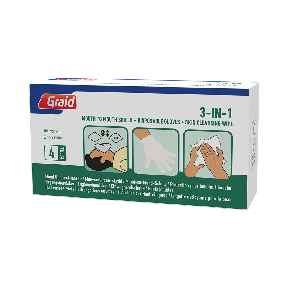 Use this mouth to mouth kit before and during first help actions. Designed to prevent direct contact between mouth and nose during rescue actions. The kit contains a breathing mask consisting of a plastic cloth equipped with a non-return valve, disposable gloves, and wet wipes.